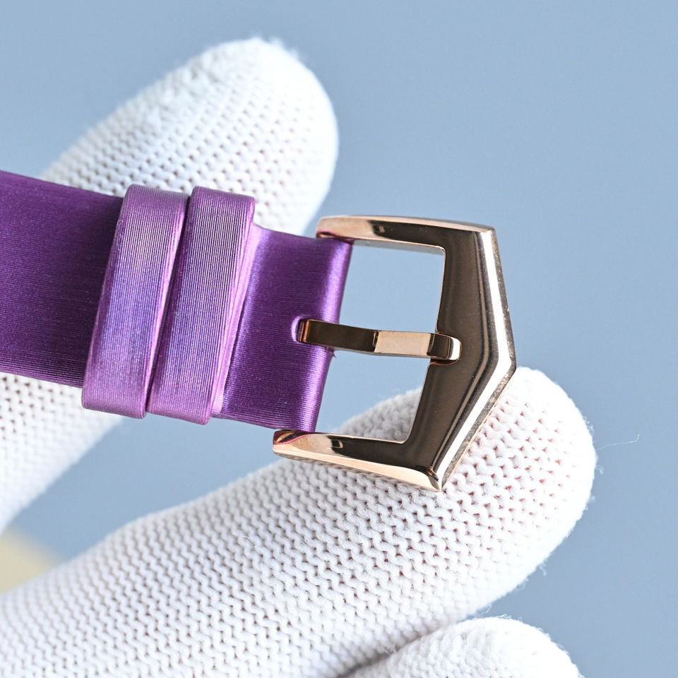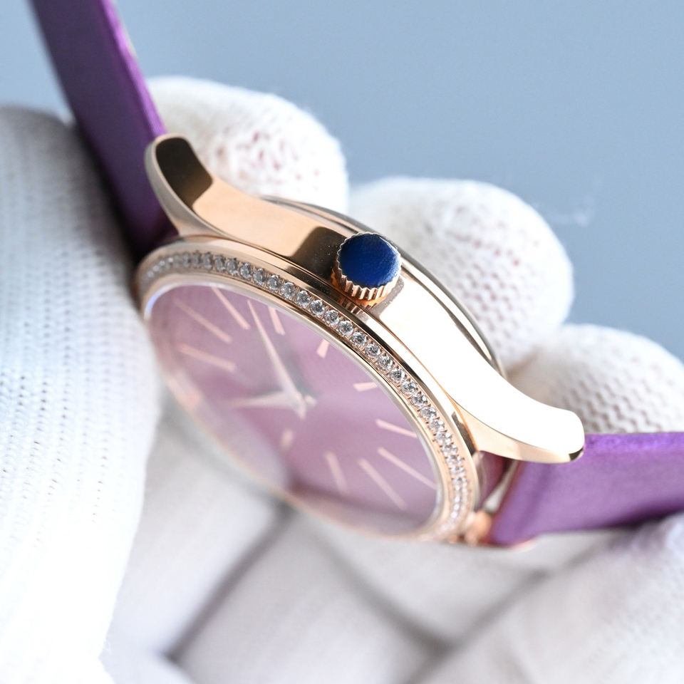 นาฬิกาหรูหราสำหรับผู้หญิง ดีไซน์หรูหรา ตัวเรือนโทนสีโรส ประดับเพชรที่ขอบตัวเรือน สายซาตินสีม่วงแดง นาฬิกาข้อมือทันสมัยสำหรับใช้ในชีวิตประจำวัน