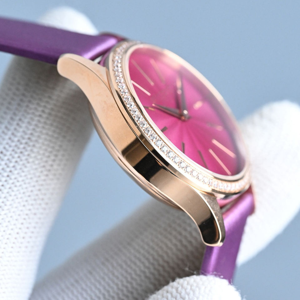 นาฬิกาหรูหราสำหรับผู้หญิง ดีไซน์หรูหรา ตัวเรือนโทนสีโรส ประดับเพชรที่ขอบตัวเรือน สายซาตินสีม่วงแดง นาฬิกาข้อมือทันสมัยสำหรับใช้ในชีวิตประจำวัน