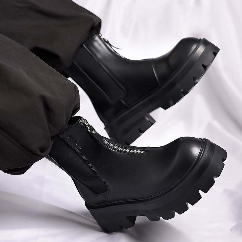 บูทหุ้มข้อหนังสำหรับผู้ชาย, รองเท้าบูทหนังเพิ่มความสูงมีซิปสีดำสำหรับผู้ชายรองเท้าส้นตึกเชลซีฤดูหนาว