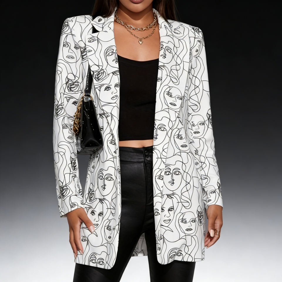 เสื้อเบลเซอร์ลายหน้าคนอินเทรนด์จาก Temu สำหรับผู้หญิง คอปก แขนยาว เปิดด้านหน้า สวมใส่ทำงานหรือลำลองได้ทุกวัน ลดราคาสุดฮอต