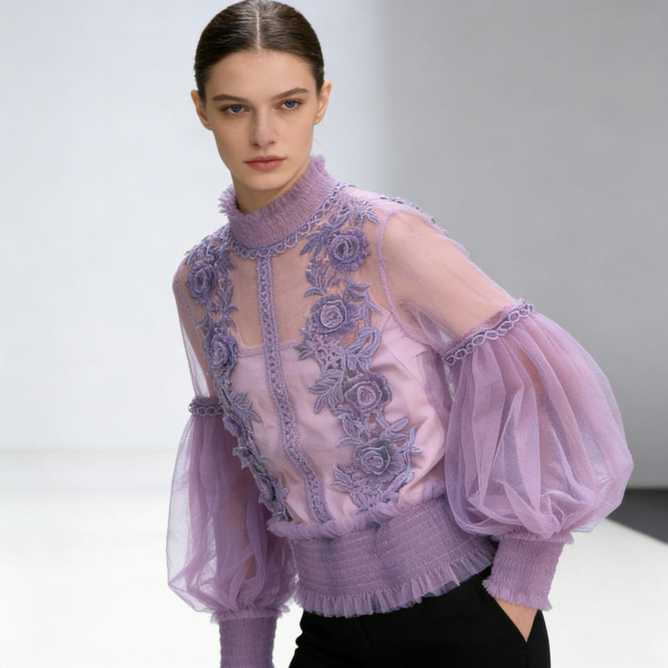 เสื้อเบลาส์ผ้าตาข่ายปักลายลูกไม้สีม่วงสุดหรูสำหรับผู้หญิงจาก Temu คอสูง แขนพอง โปร่งบาง กำลังลดราคา