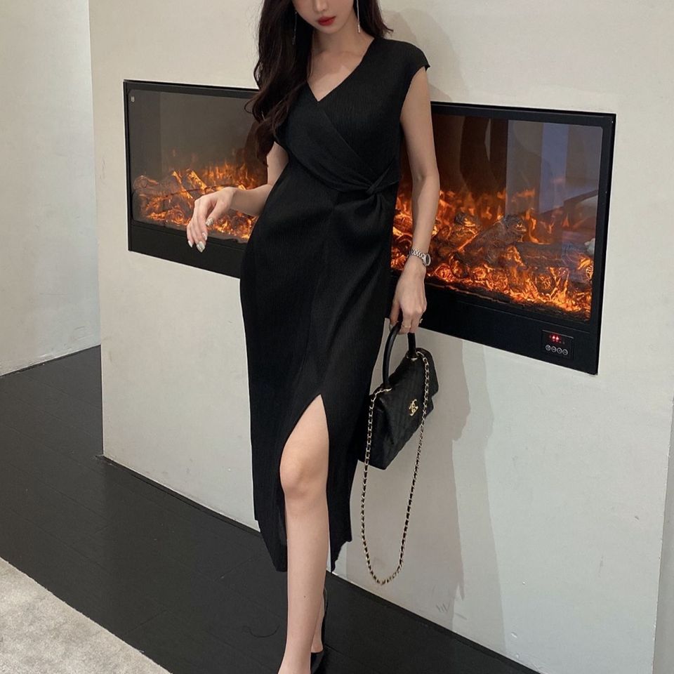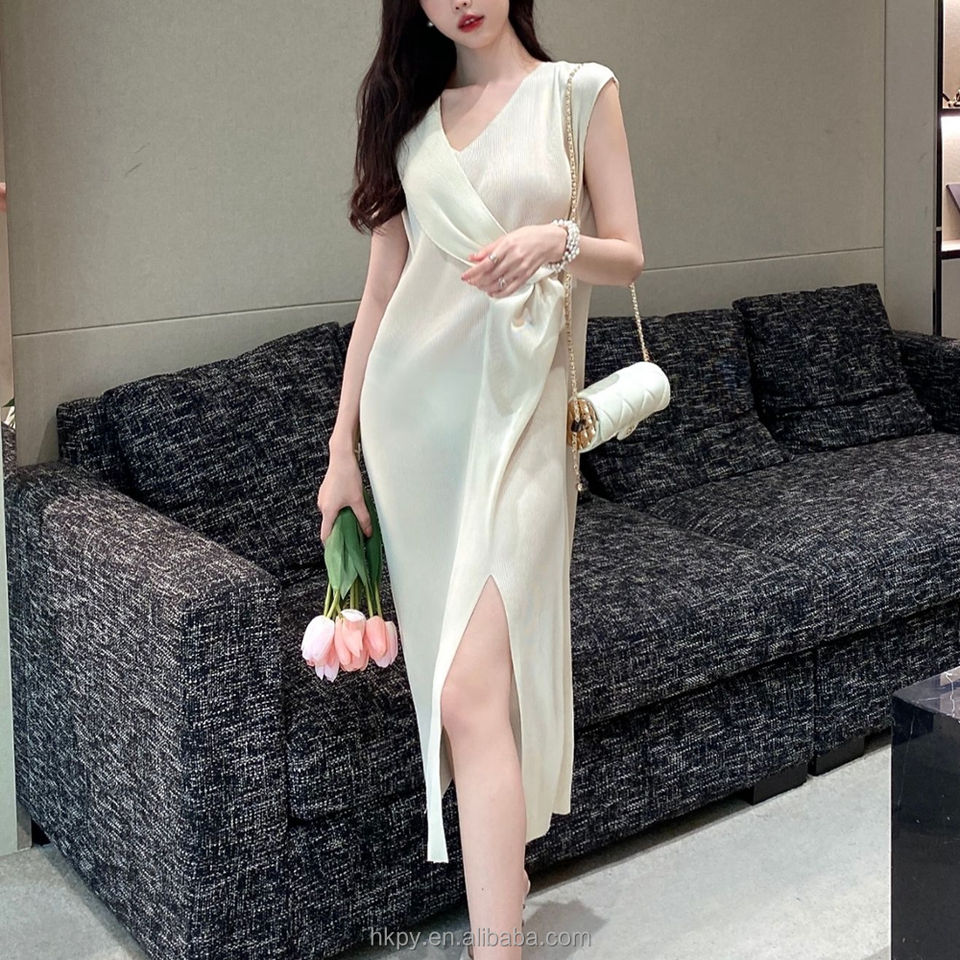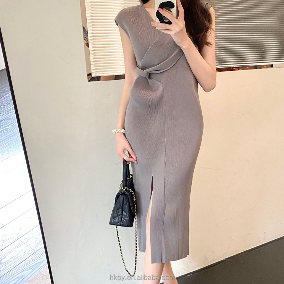 Hot Sale New Style Ladies Sexy Summer Evening Midi Elastic Pleated Hip Wrap Ruched Front Slit Design Celebrity Style Wholesale