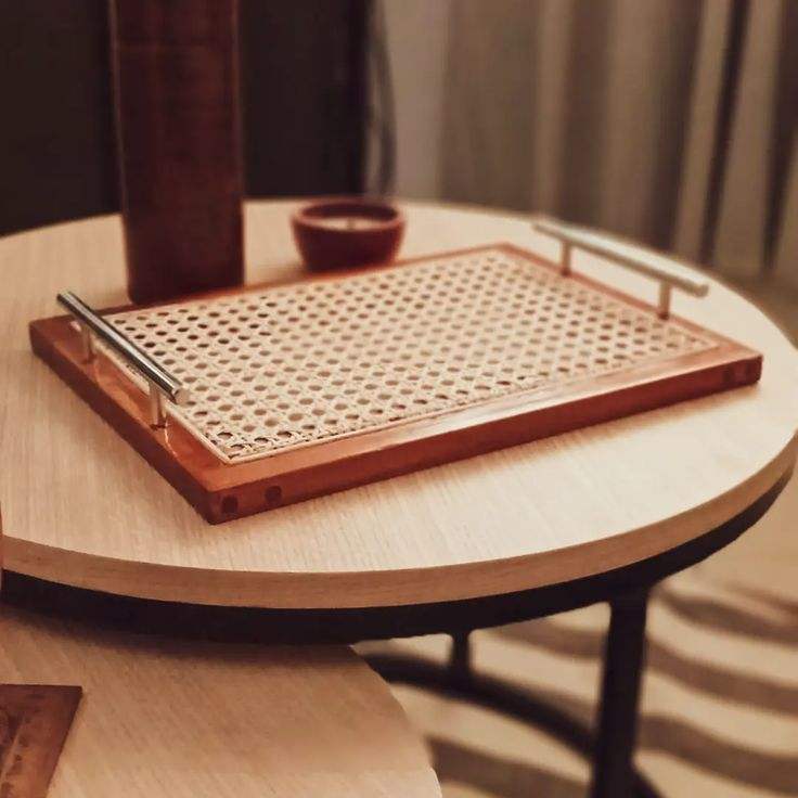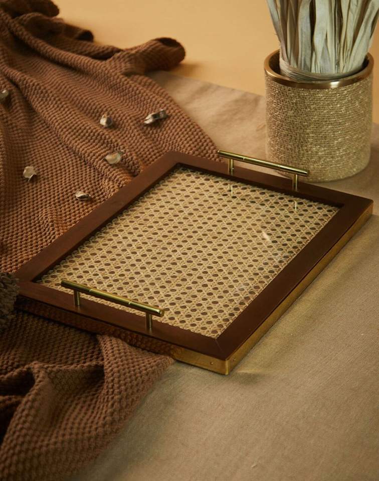 ถาดไม้สำหรับจัดเก็บและเสิร์ฟ พร้อมฐานสานหวายและหูจับโลหะ ดีไซน์หรูหราสำหรับโต๊ะอาหาร ห้องครัว และเสิร์ฟกาแฟ ขายดี