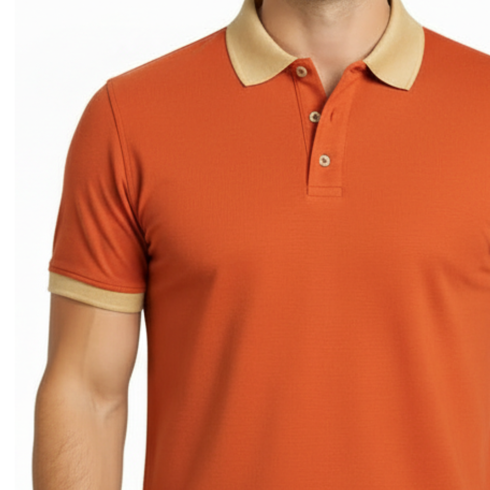 เสื้อโปโลชายสีส้มไหม้ขายดี คอปกสีทองตัดกัน ทรงเข้ารูป แขนสั้น สำหรับตีกอล์ฟ