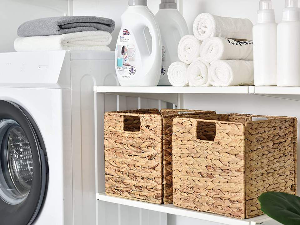 ตะกร้าสานมือทรงสี่เหลี่ยมมีมือจับในตัวตะกร้าหวายสำหรับเก็บผักตบชวา