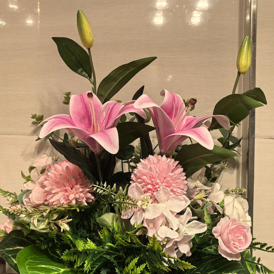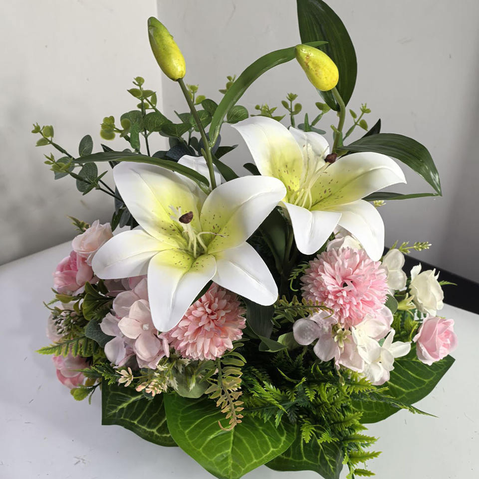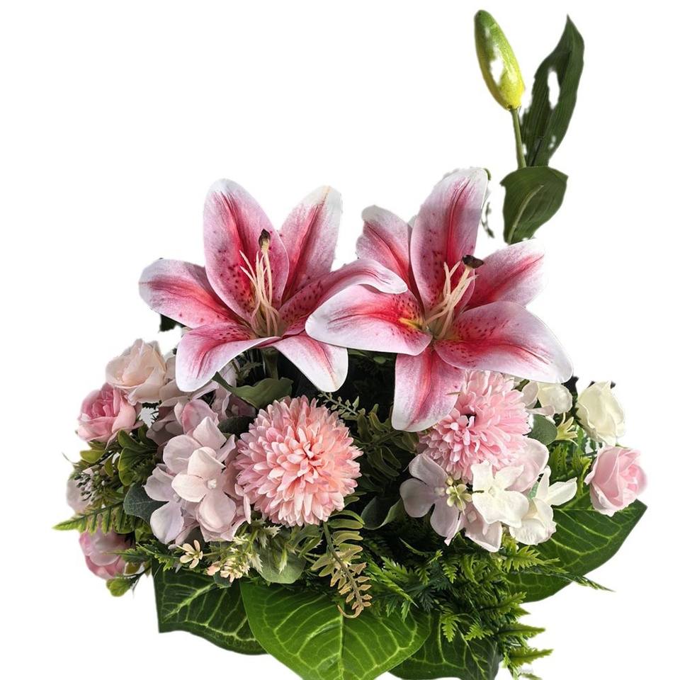 ดอกไม้ประดิษฐ์ขายดี กระถางไหม ดอกทานตะวัน ดอกลิลลี่ ดอกกุหลาบ ดอกไฮเดรนเยีย ผสมสีชมพู สำหรับตกแต่งงานแต่งงาน ตกแต่งบ้าน ตกแต่งโต๊ะ