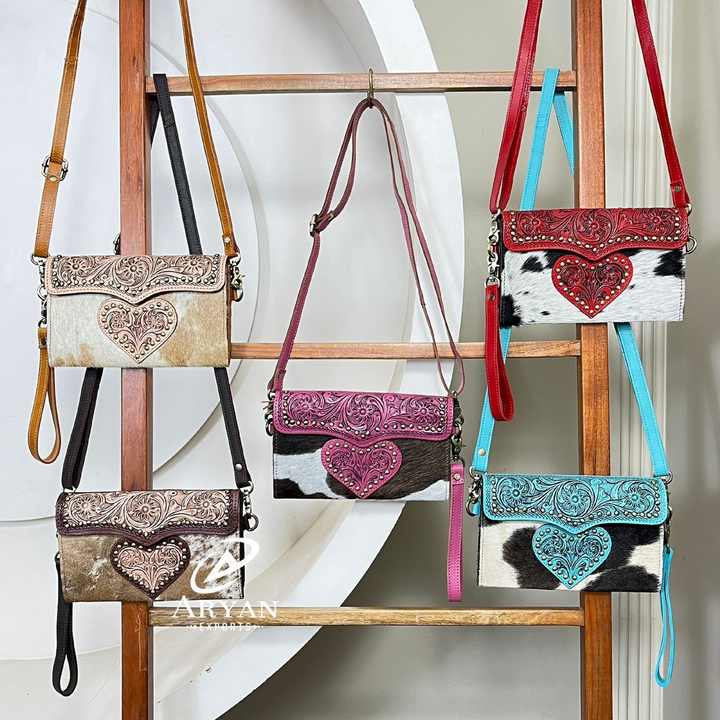 Hot selling Western Turquoise Hand Tooled Cowhide Leather Crossbody Mini Purse Heart Pattern Clutch Adjustable Shoulder Strap