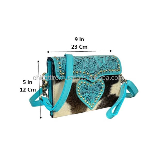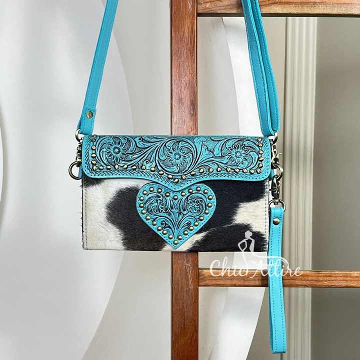กระเป๋าสะพายข้างหนังวัวแท้ลายหัวใจสไตล์ตะวันตกสีเทอร์ควอยซ์ งานแฮนด์เมด ขายดี พร้อมสายสะพายไหล่ปรับได้