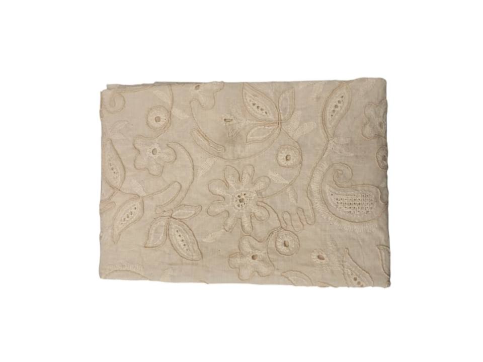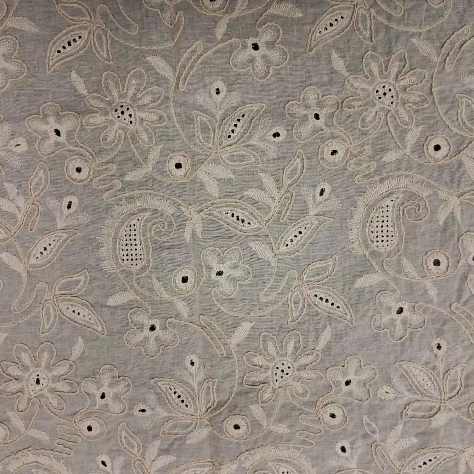 ผ้าฝ้ายสีขาวปักลายดอริ/ลายเชือก งานปักลายนูนลายดอกไม้และลายเพสลีย์ ลวดลายเถาวัลย์ ดีไซน์หรูหรา มีเท็กซ์เจอร์แบบ 3 มิติ ขายดี