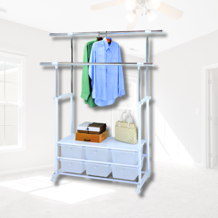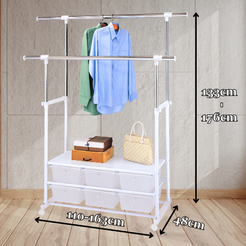 ราวแขวนเสื้อผ้าแบบตั้งได้มีล้อราวแขวนเสื้อผ้าแบบคู่ประกอบง่าย