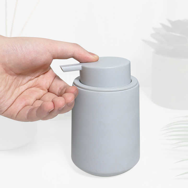 เครื่องจ่ายสบู่เหลวเซรามิกเกรดโรงแรม เป็นมิตรกับสิ่งแวดล้อม แบบกด 2 ฟังก์ชั่น สำหรับห้องน้ำ ใช้ซ้ำได้ ขนาด 300 มล.