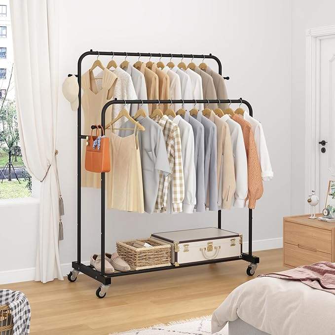 ราวแขวนเสื้อผ้าแบบมีล้อสำหรับใช้ในโรงแรม ราวแขวนเสื้อผ้าพร้อมตะขอ 4 อัน ราวแขวนเสื้อผ้าอเนกประสงค์สำหรับห้องนอน สีสันสดใส