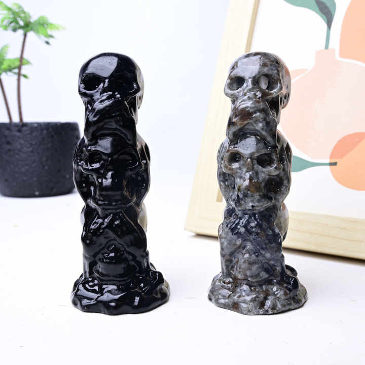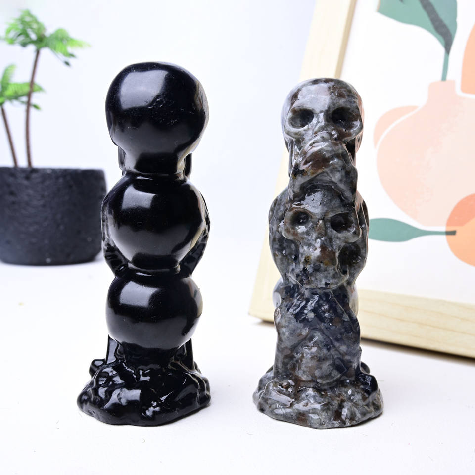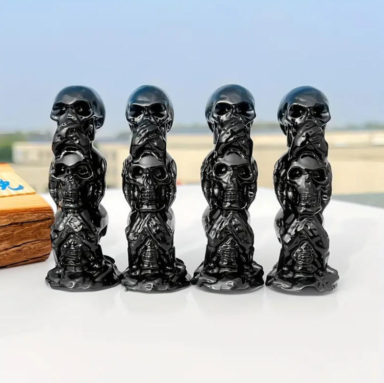 งานฝีมือคุณภาพสูงจากหินออบซิเดียนสีดำแกะสลักด้วยมือรูปหัวกะโหลกสามหัว เหมาะสำหรับตกแต่งและเป็นของขวัญ ลดราคาพิเศษ