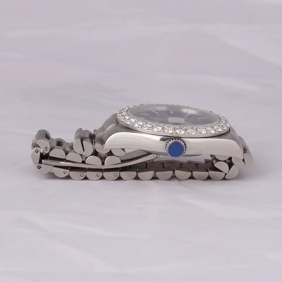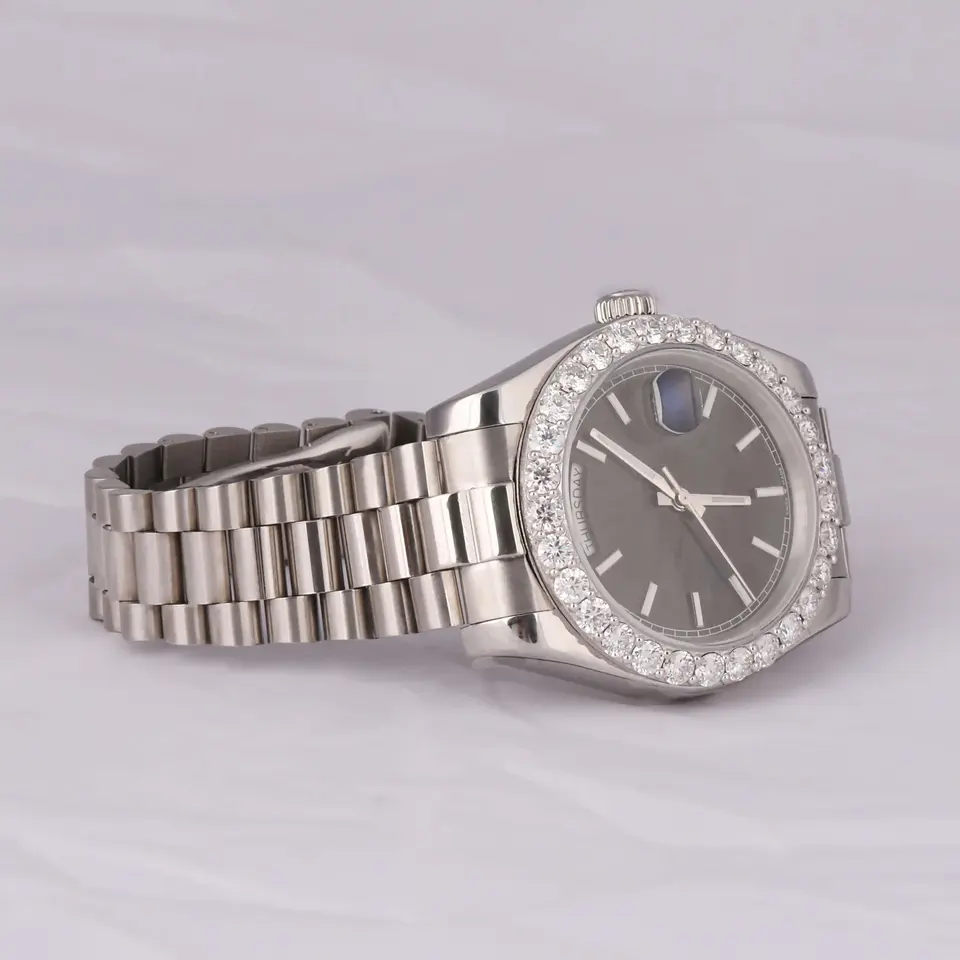 นาฬิกาเพชรสุดหรูที่ร้อนแรงที่สุดพร้อมหน้าปัดชุบเงินหน้าปัดสีดำเคลือบด้วยสแตนเลสสตีลนาฬิกาผู้ชาย