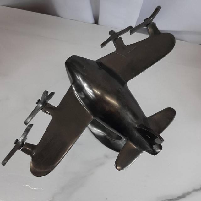 รูปปั้นเครื่องบินเทอร์โบสีเงินติดอยู่บนฐานหรือของตกแต่งโต๊ะบนเครื่องบินอลูมิเนียมสไตล์วินเทจ