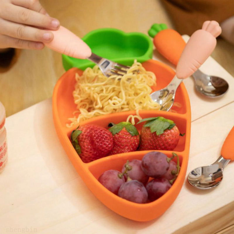จานซิลิโคนรูปแครอทสำหรับเด็ก พร้อมช่องแบ่งอาหาร กันลื่น พร้อมช้อน ส้อม และหลอดดูด
