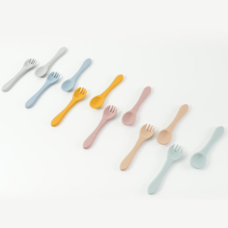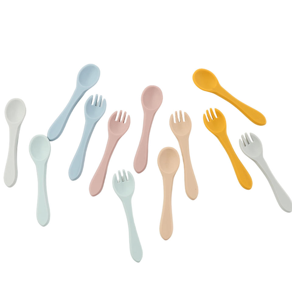 ชุดช้อนและส้อมซิลิโคนปลอดสาร BPA เป็นมิตรกับสิ่งแวดล้อมสำหรับเด็กทารก อุปกรณ์ฝึกทานอาหารสำหรับเด็กวัยหัดเดิน