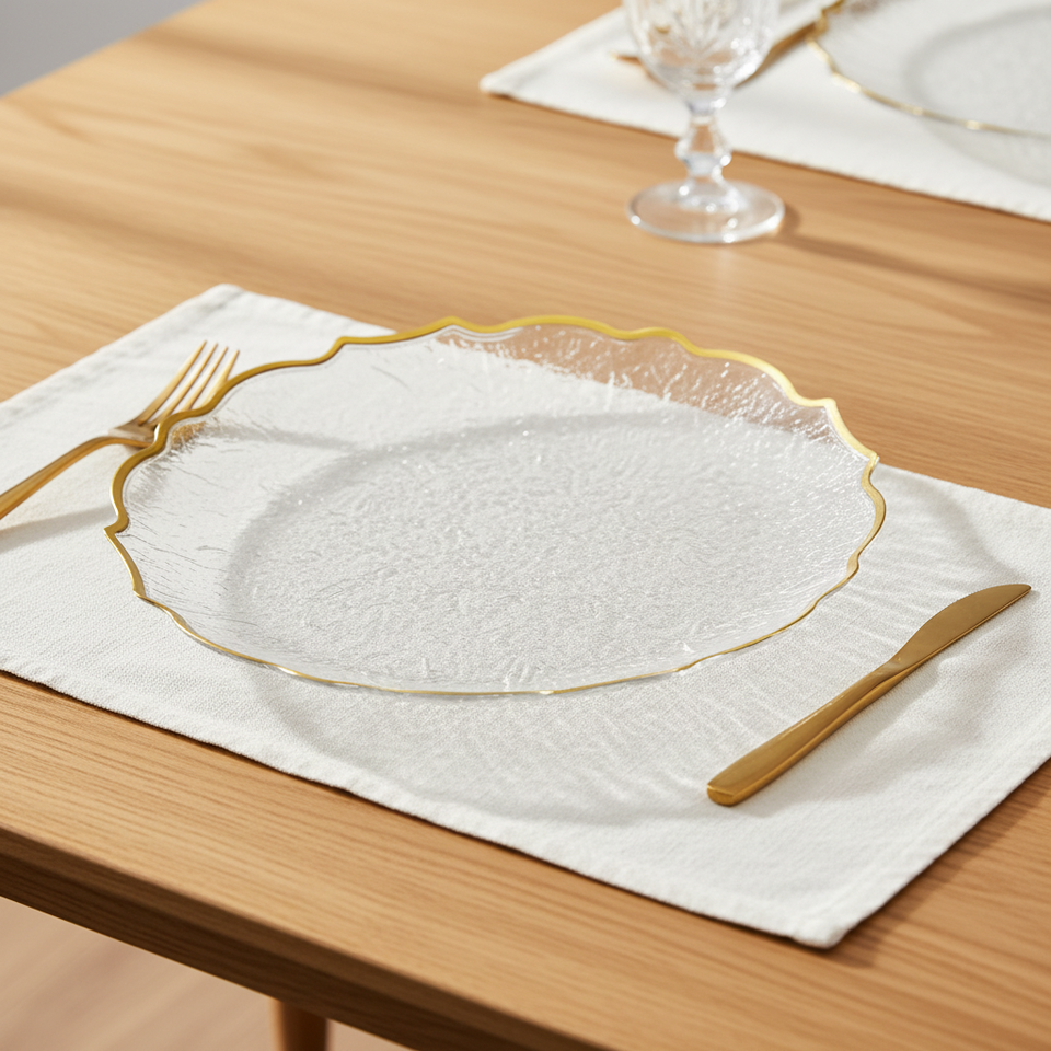 Household Goods Round, Disposable, Transparent Plastic Charging Pad with Gold Edges for Wedding Events