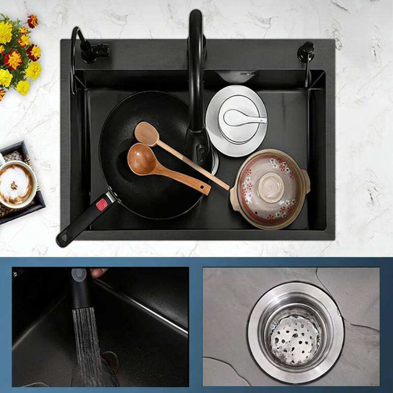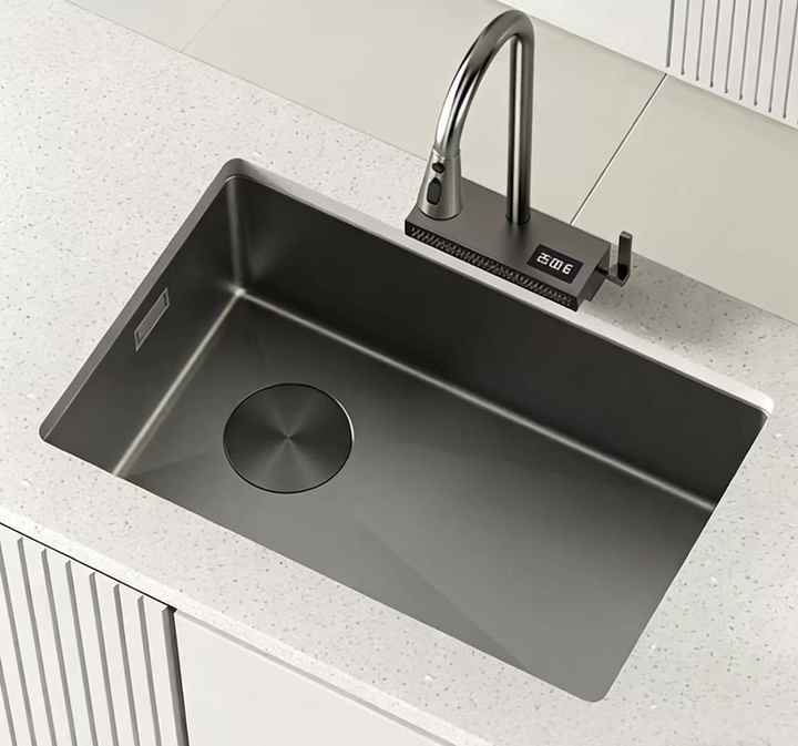 อ่างล้างจานครัวสแตนเลสทรงสี่เหลี่ยมขนาดใหญ่แบบมีร่องลายเปียโน พร้อมหน้าจอดิจิตอลแสดงผลแบบฝนตก