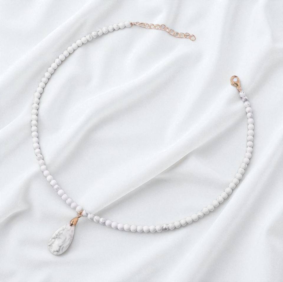 สร้อยคอลูกปัด howlite พร้อมจี้หยดน้ำตา-สร้อยคอเสน่ห์ทำด้วยมือเงิน925