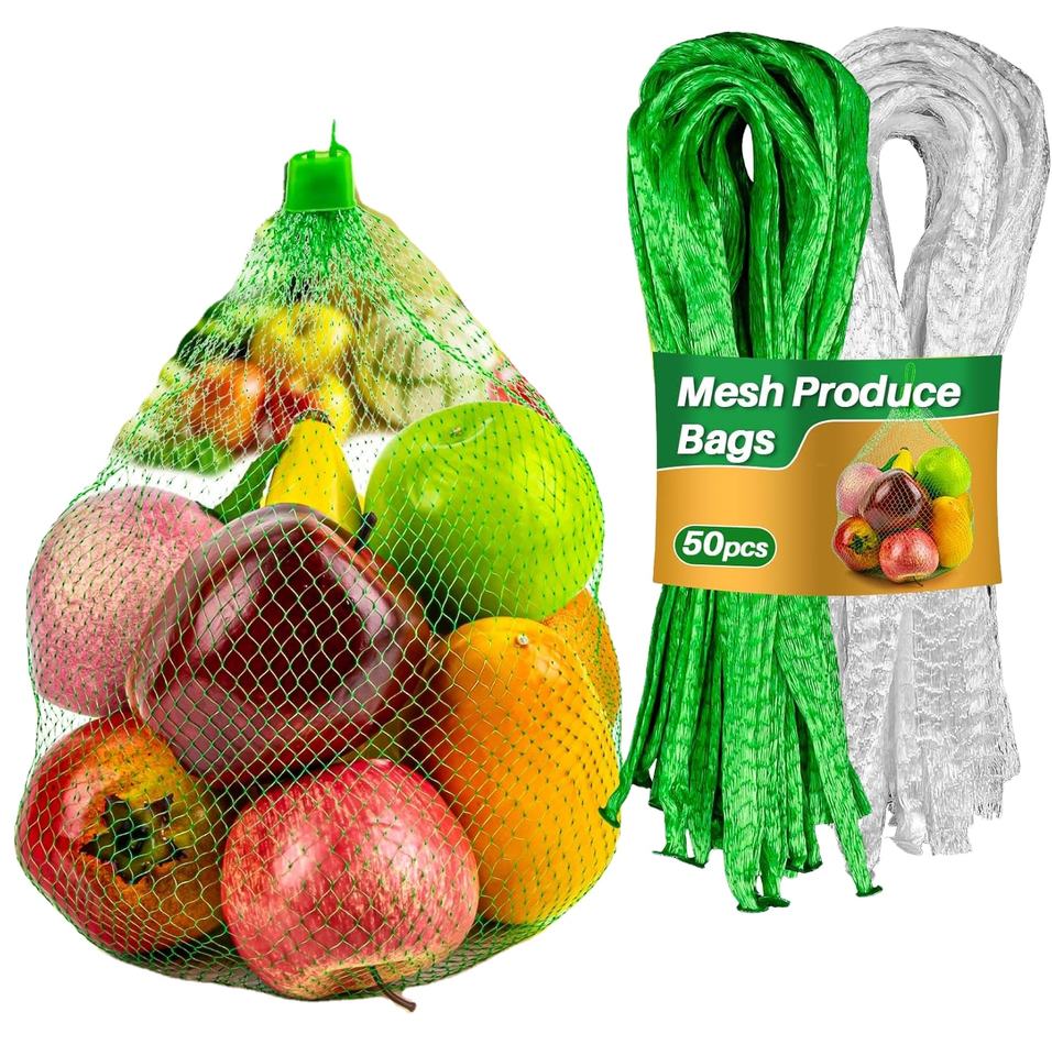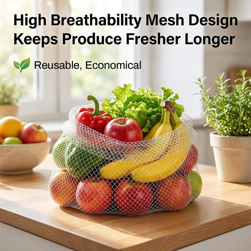 ถุงตาข่ายใส่ผลไม้และผัก Huamaohengchun ขนาด 20 นิ้ว ทำจาก LDPE ทนทาน พร้อมหูรูดสำหรับเก็บผัก หัวหอม อาหารทะเล และผลไม้