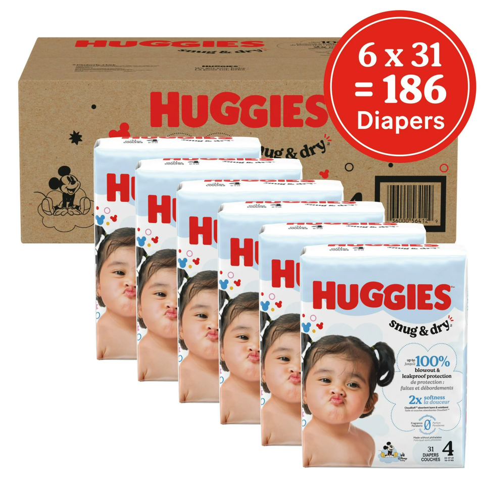 ผ้าอ้อมเด็ก Snug & Dry ไซส์ 4 (16-18 ปอนด์) แพ็ค 186 ชิ้น ป้องกันการรั่วซึม นุ่ม ระบายอากาศได้ดี ลายพิมพ์ ฟลัฟพัลป์ DE