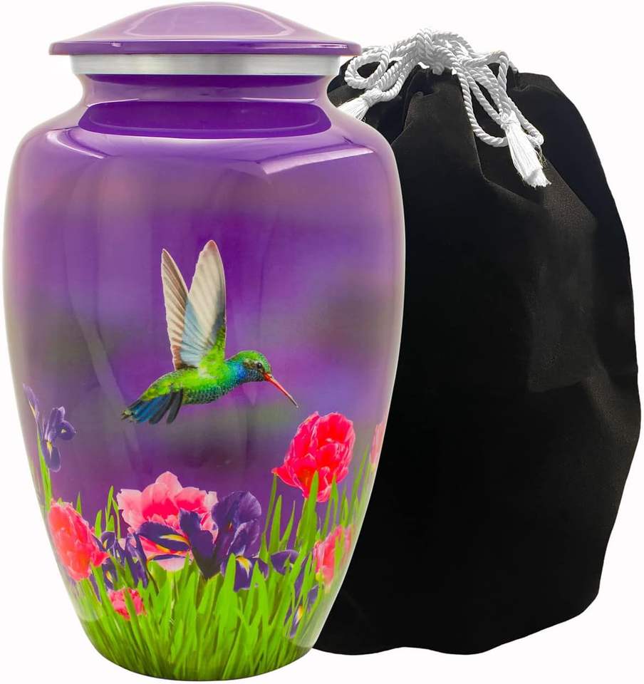 โกศฮัมมิงเบิร์ดสำหรับผู้ใหญ่สำหรับใส่ขี้เถ้ากระดูกใหญ่สำหรับขี้เถ้าของมนุษย์โกศสีม่วงใส่ดอกไม้สีเหลืองได้ตามต้องการ