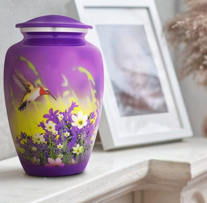 โกศฌฌาปนกิจนกฮัมมิงเบิร์ดสำหรับมนุษย์ขี้เถ้าอลูมิเนียมสีม่วงสำหรับผู้ใหญ่
