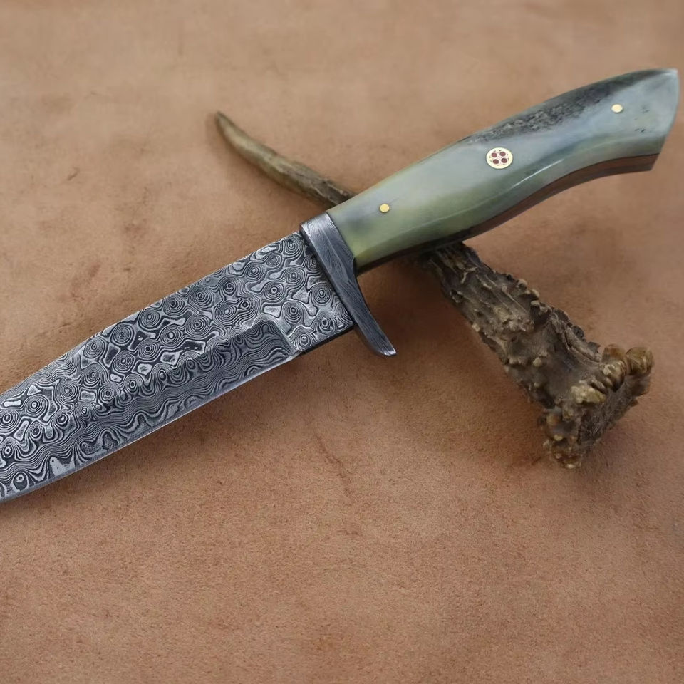 มีดสกินเนอร์สำหรับล่าสัตว์ ทำจากเหล็กดามัสกัส ขอบคมบางส่วน น้ำหนักเบา ทนทาน ด้ามจับทำจากกระดูก พร้อมการรับประกัน 3 ปี