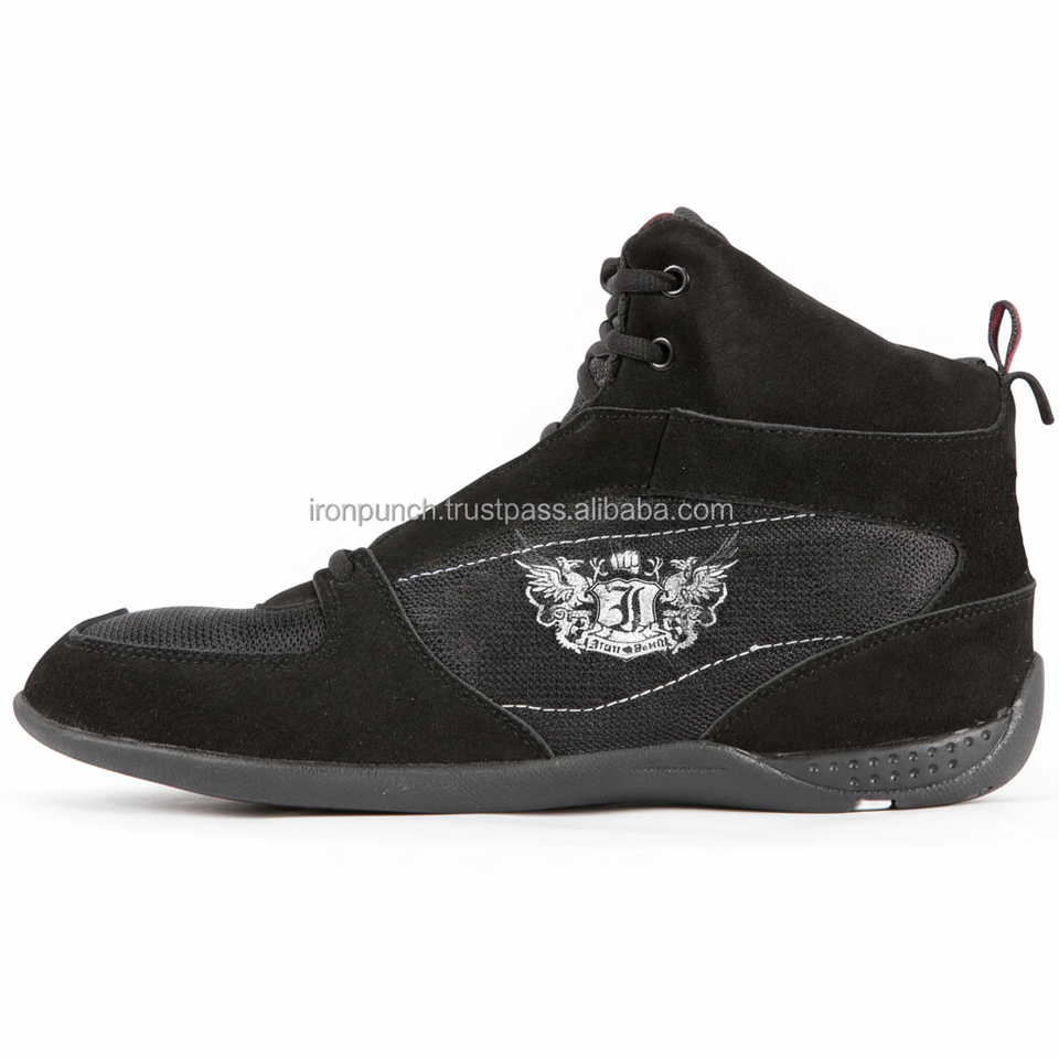 รองเท้าชกมวย Hype พร้อมโลโก้แบบกำหนดเอง วัสดุหนังและพลาสติก ปิดแบบผูกเชือก พื้นรองเท้าหนาทนทานเพื่อความปลอดภัยในการเล่นกีฬา