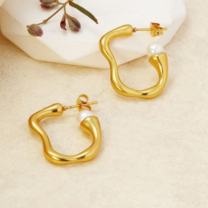 ต่างหูห่วงมุกน้ำจืดแฟชั่นสำหรับผู้หญิง ชุบทอง 18K PVD คุณภาพสูง ป้องกันการแพ้ ขายส่ง