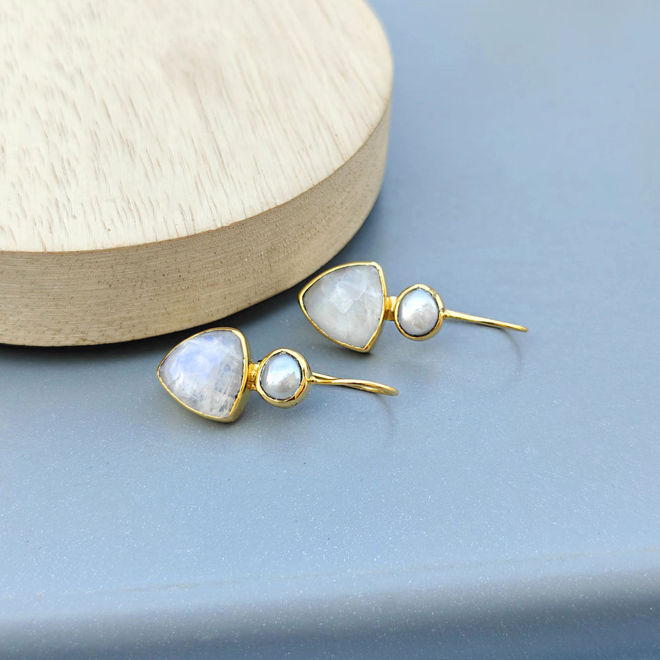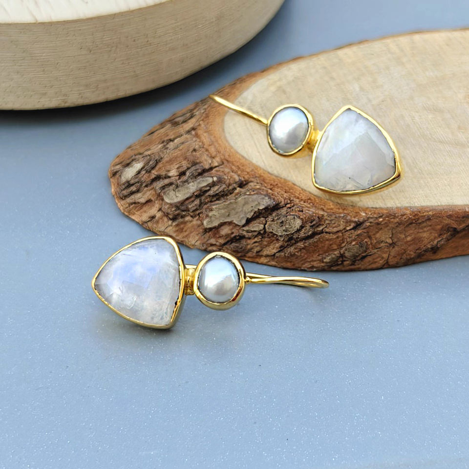 ต่างหูแบบห้อยทำมือ สไตล์เรขาคณิต ชุบทอง 18k ประดับมูนสโตนธรรมชาติและไข่มุกน้ำจืด สำหรับผู้แพ้ง่าย