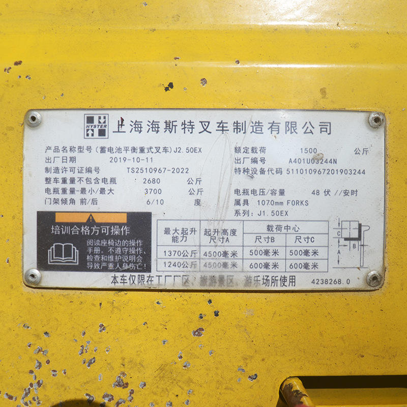 รถยกไฟฟ้าฮิสเตอร์ 1.5 ตัน มือสอง พร้อมงาขนาด 125 มม. และระยะศูนย์รับน้ำหนัก 500 มม.