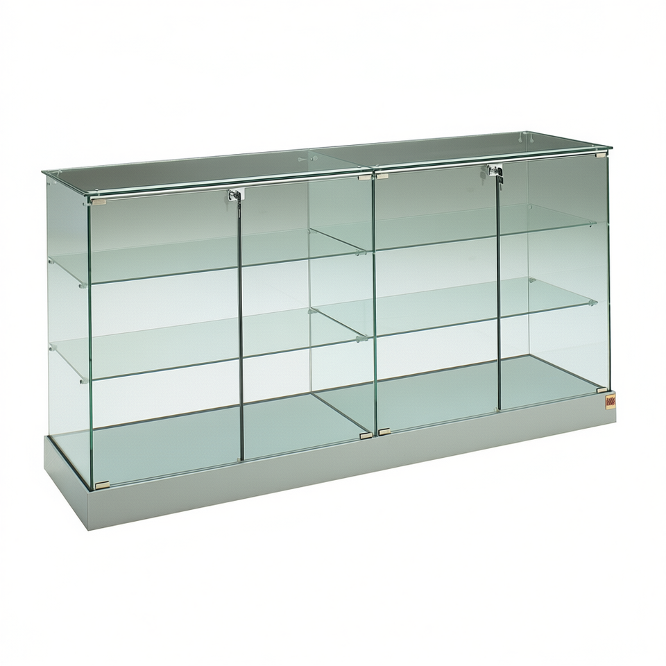 ตู้โชว์ Hz Counter ขนาดกว้าง 145 ซม. สูง 90 ซม. สีเทาอ่อน ฐานมีล้อเลื่อนแบบซ่อน ประตูบานพับแบบล็อคได้