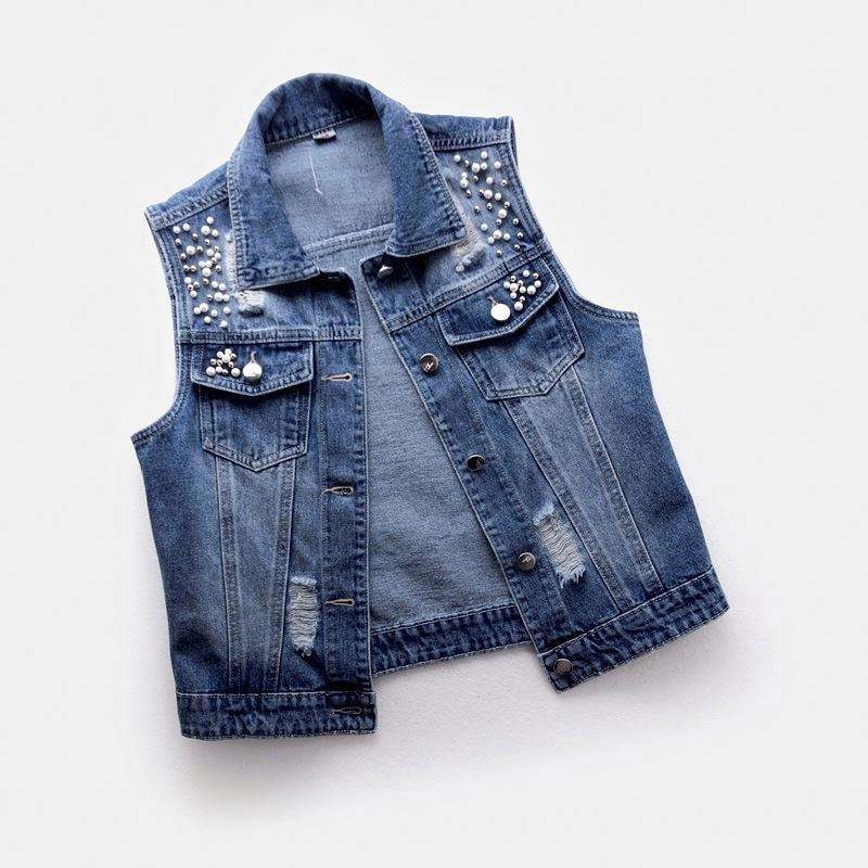 เสื้อกั๊กยีนส์ผู้หญิง รุ่น I-0593 สไตล์ใหม่ ลุคขาดๆ ปักลาย แจ็คเก็ตแขนกุด เสื้อแจ็คเก็ตยีนส์ผู้หญิง