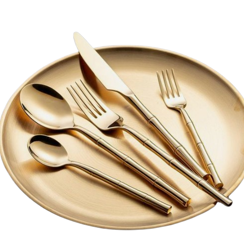 ไอ.เค. ชุดช้อนส้อมสแตนเลสเคลือบทองดีไซน์ทันสมัยพร้อมด้ามจับไม้ไผ่ เป็นมิตรกับสิ่งแวดล้อม สำหรับร้านอาหารหรูหรา