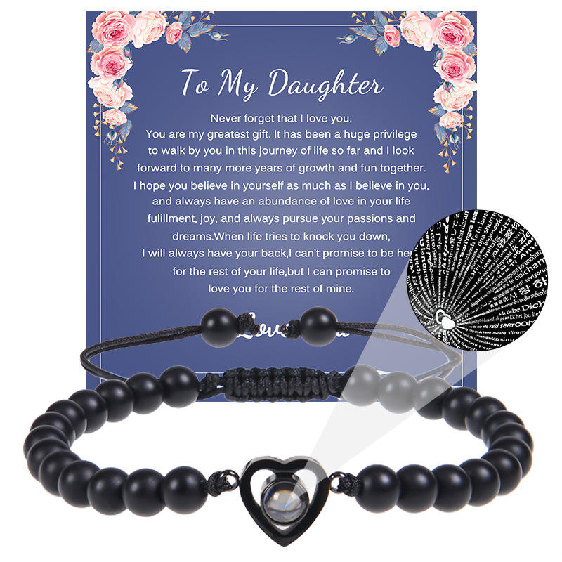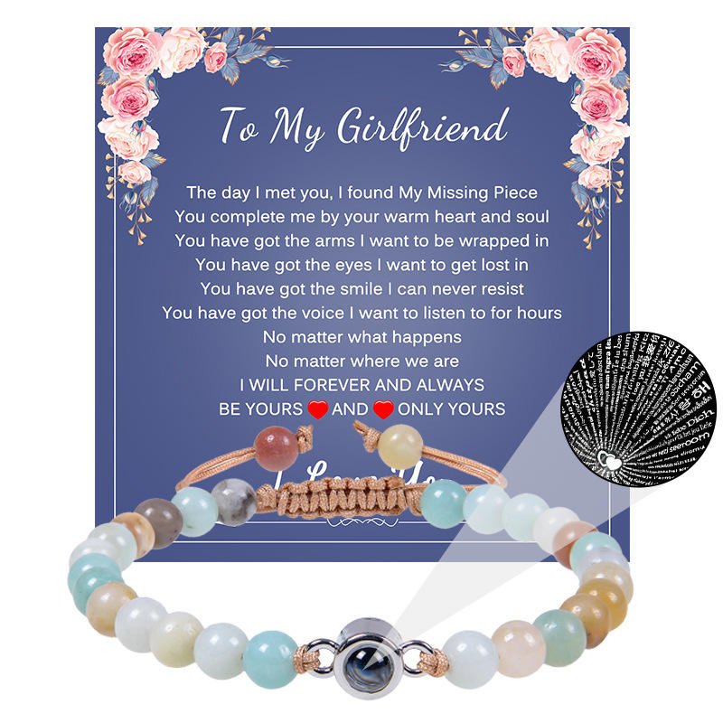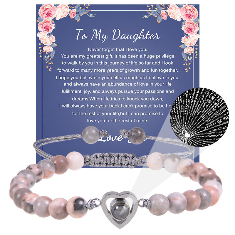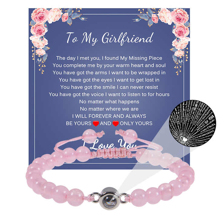 I Love You 100 Languages Heart Charm Natural Pink Crystal Quartz Stone Rope Braided Adjustable Bracelet With Paper Card for Wife