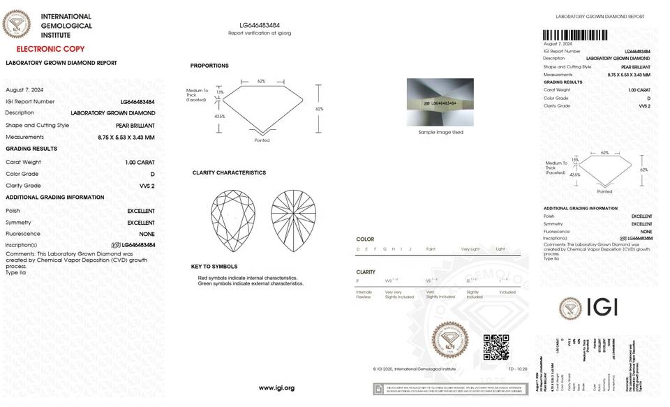 ใบรับรอง IGI 1.00 ct. ลูกแพร์ตัดแล็บปลูก CVD เพชร8.75มม. VVS2สี D สำหรับเครื่องประดับที่สวยงาม