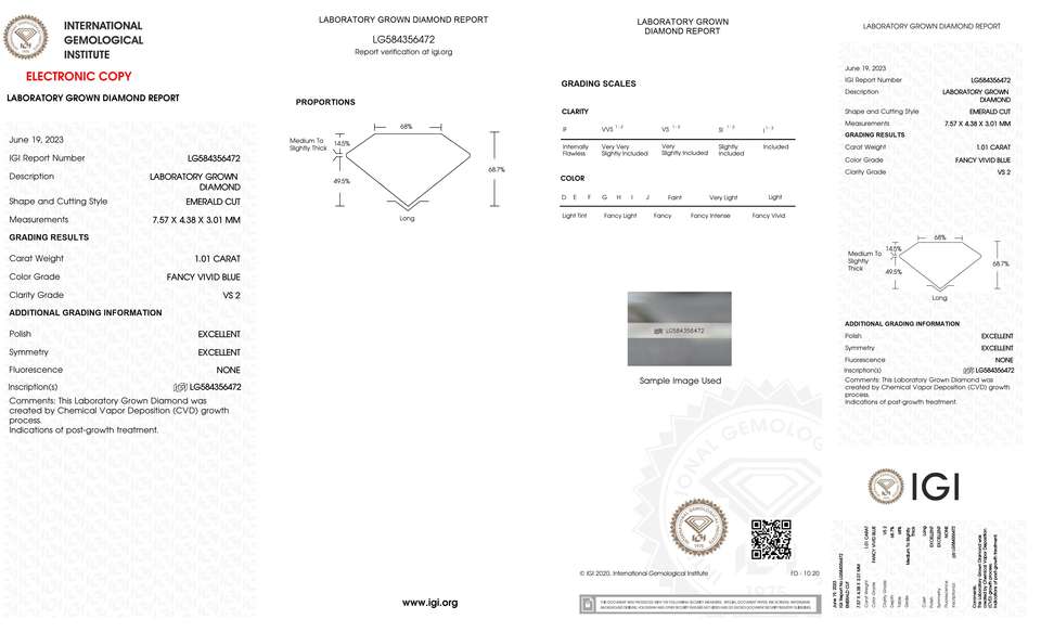 Igi ได้รับการรับรอง1.01ct แฟนซีสีฟ้าสดใส VS2ความชัดเจนสดใสมรกตตัดหลวมห้องปฏิบัติการที่ปลูกเพชรเม็ดเดี่ยวสำหรับการใช้เครื่องประดับ