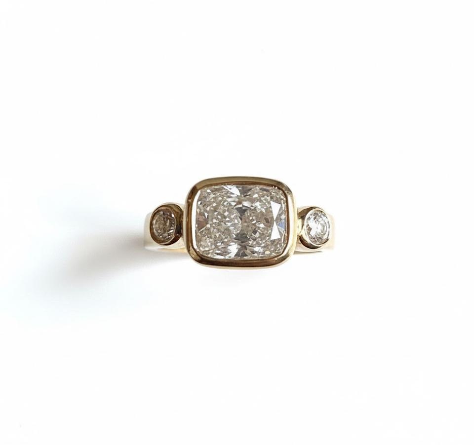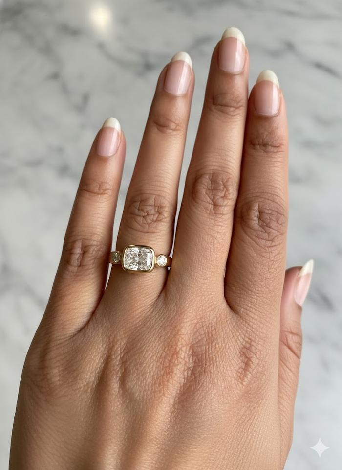 แหวนเพชรทรงสี่เหลี่ยมผืนผ้าแบบคุชชั่นคัท เพชรสร้างในห้องปฏิบัติการ ทองคำแท้ 18K ได้รับการรับรองจาก IGI แหวนสามเม็ด ฝังแบบเบเซล แหวนหมั้น