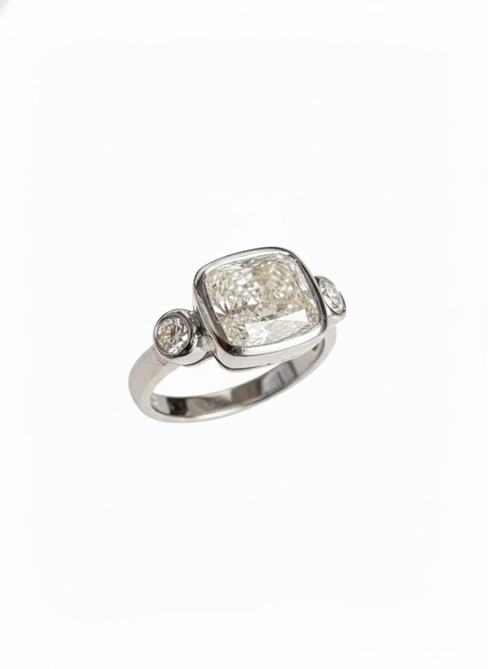 แหวนเพชรทรงหมอน ฝังเพชรสามเม็ด ตัวเรือนทอง 18K