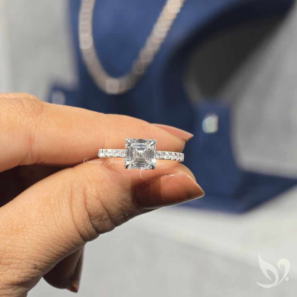 แหวนเพชรทรงแอสเชอร์ 2 กะรัต ผลิตในห้องปฏิบัติการ ได้รับการรับรองจาก IGI | แหวนทองคำแท้ 10K แบบวงแหวนซ่อน