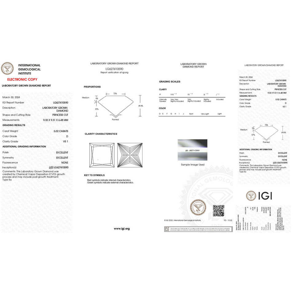 เพชรทรงปรินเซสคัทที่ได้รับการรับรองจาก IGI น้ำหนัก 5.02 กะรัต เพชรเพาะเลี้ยงในห้องปฏิบัติการ ความสะอาดระดับ VS1 สี D ขัดเงาอย่างดี ความลึก 69.60% ขนาด 1.00 มม. เพชรเม็ดเดี่ยว