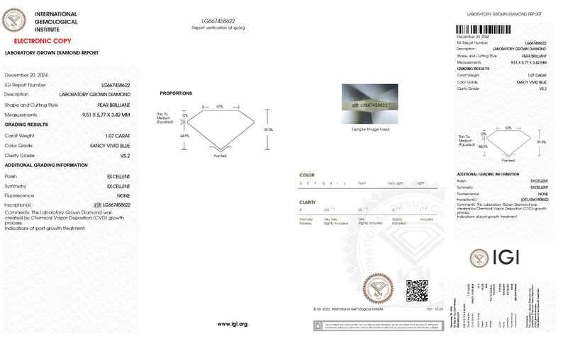 เพชร IGI Certified ระดับความสะอาด VS ทรงลูกแพร์ สีฟ้าแฟนซี 4 นิ้ว ผลิตในห้องปฏิบัติการ สำหรับทำเครื่องประดับ