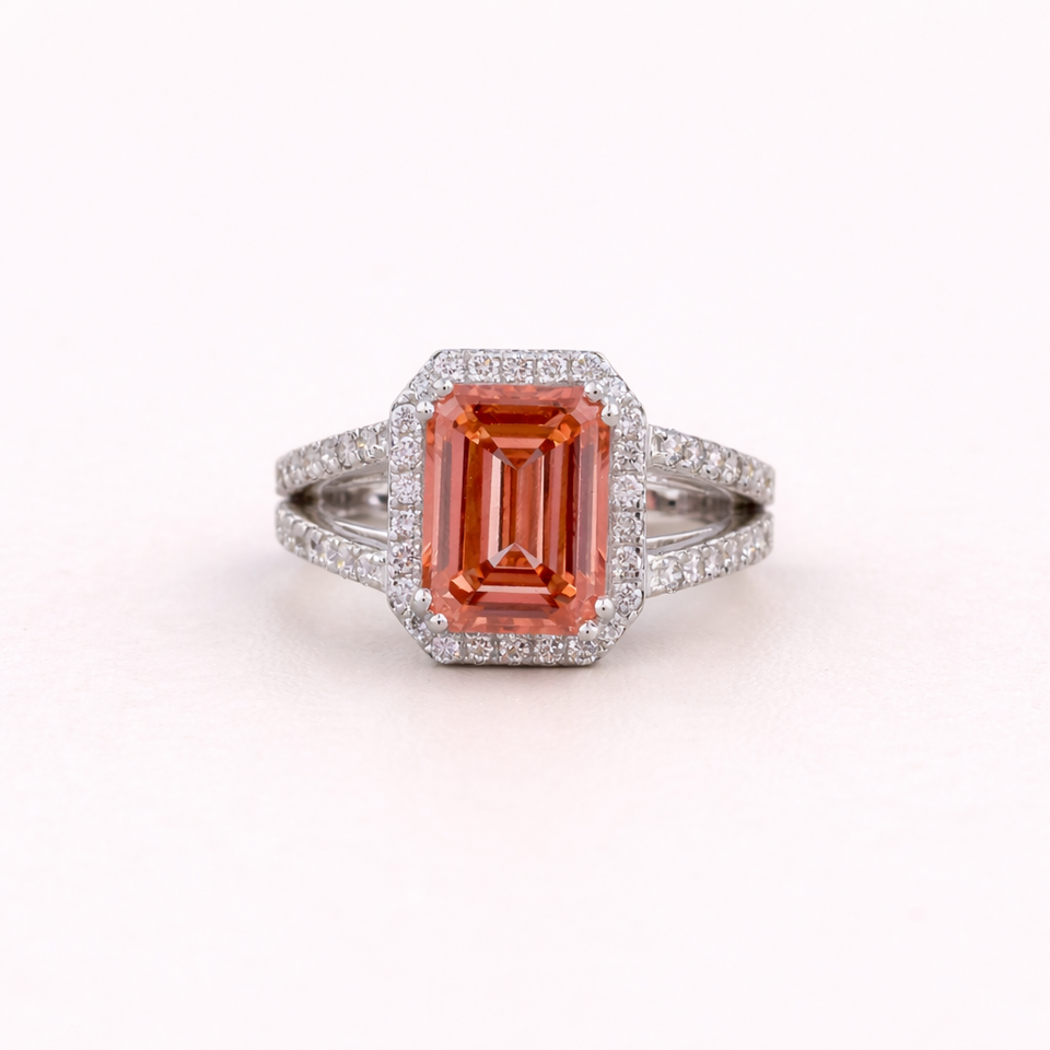Keyword:IGI Certified Emerald Cut Orange Lab Diamond Ring with Pavé Shank