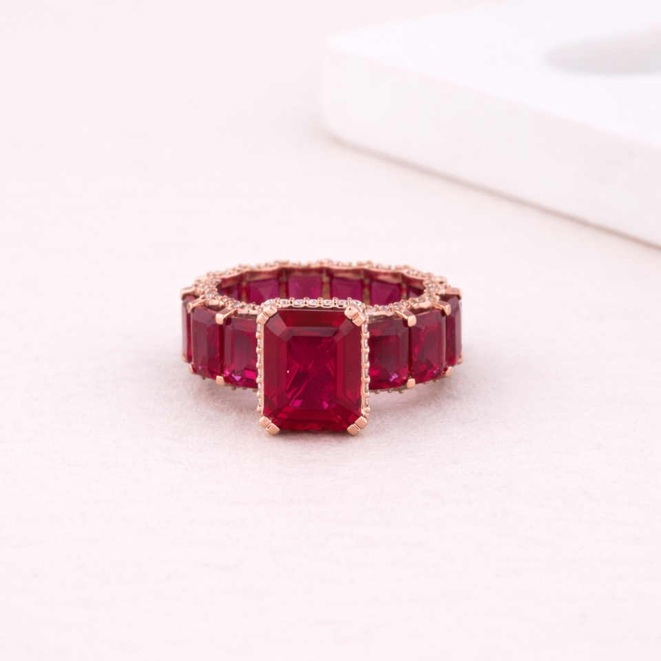 Keyword:Emerald Cut Ruby Eternity Halo Ring