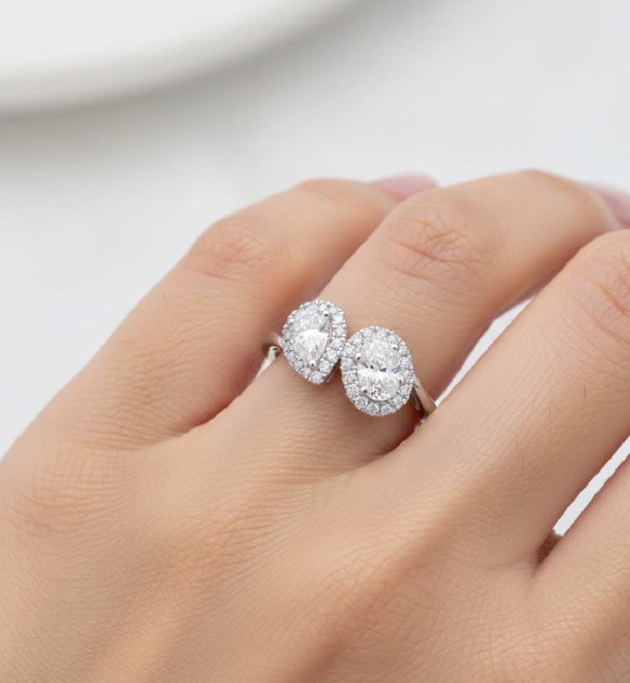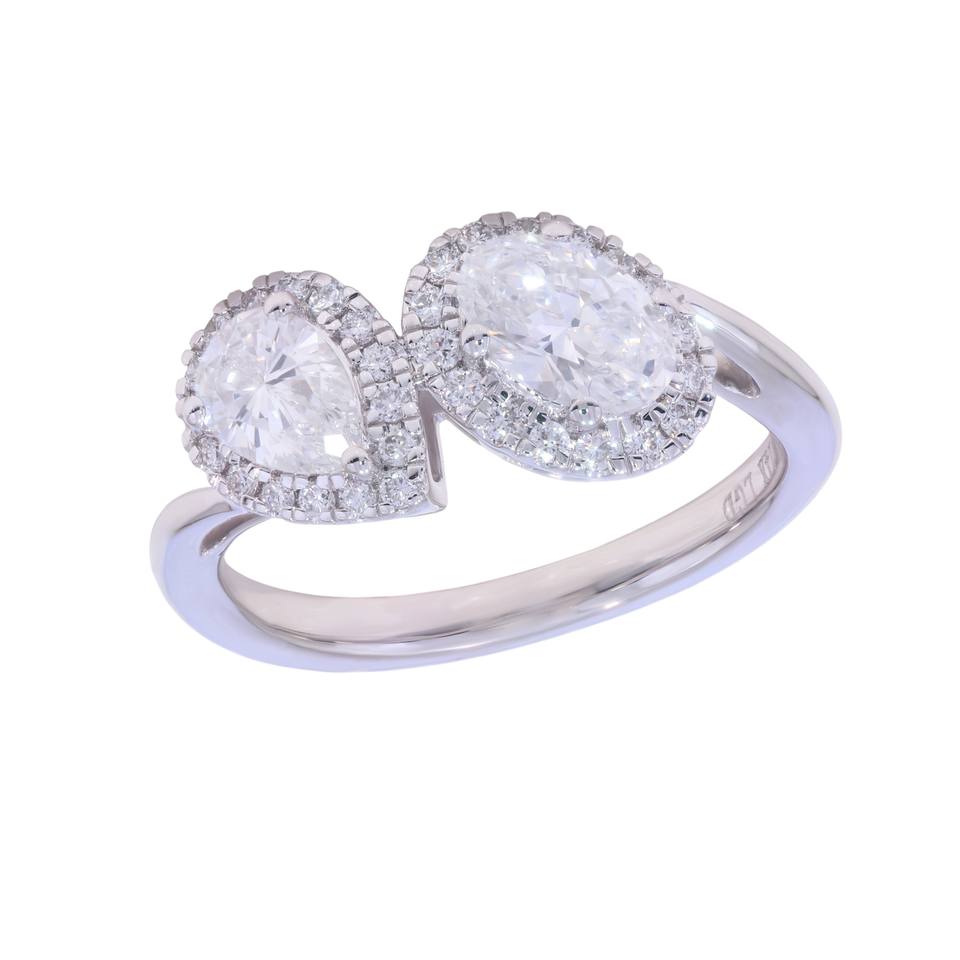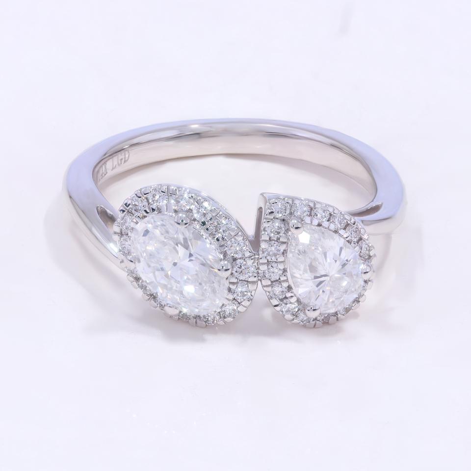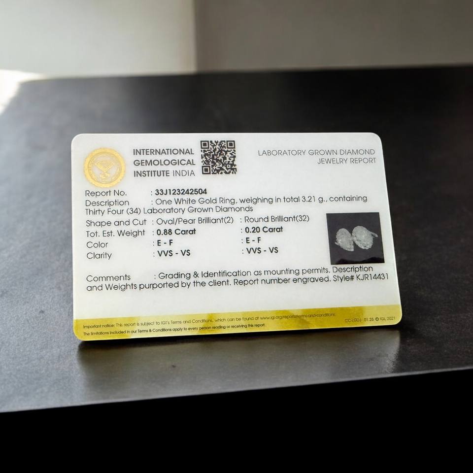 แหวนหมั้นทันสมัยที่ได้รับการรับรองจาก IGI ประดับเพชรทรงโอวอลแบบฮาโล น้ำหนัก 1.08 กะรัต สี E-F ความสะอาด VVS-VS เพชรเลี้ยงในห้องปฏิบัติการ ตัวเรือนทองคำขาว 14K