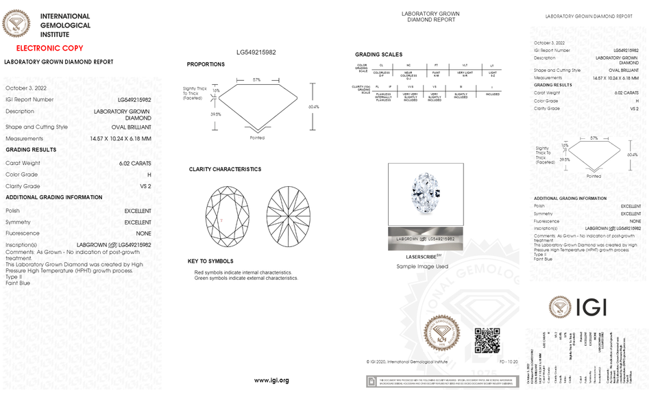 Igi VS2ตัดทรงรีที่ดีเยี่ยม C;arity 6.02กะรัตห้องปฏิบัติการการปลูกเพชรหลวมสำหรับการทำเครื่องประดับแหวนแต่งงาน