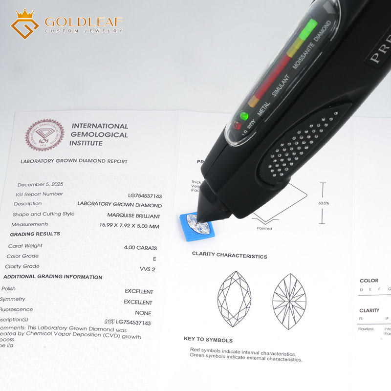 เพชรทรงมาร์คีส์ แบรนด์โกลด์ลีฟ รับรองโดย IGI สี DEF ขนาด 1-7 กะรัต ความสะอาดระดับ VVS VS1 ผลิตด้วยวิธี HPHT CVD สำหรับทำเครื่องประดับ