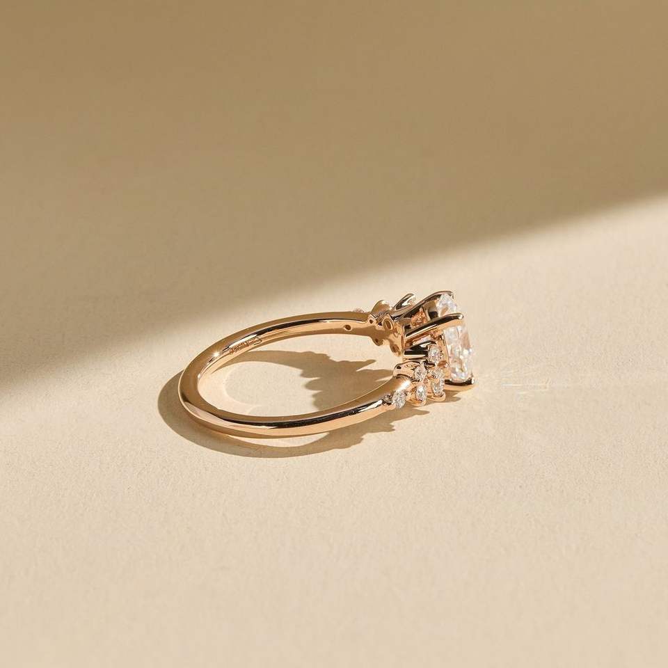 แหวนหมั้นเพชรทรงรี VS1 น้ำหนัก 2.20 กะรัต ผลิตในห้องปฏิบัติการ ได้รับการรับรองจาก IGI ดีไซน์วินเทจประดับเพชรแบบคลัสเตอร์ ตัวเรือนทองคำแท้ 14K สีเหลืองทอง สำหรับงานแต่งงาน